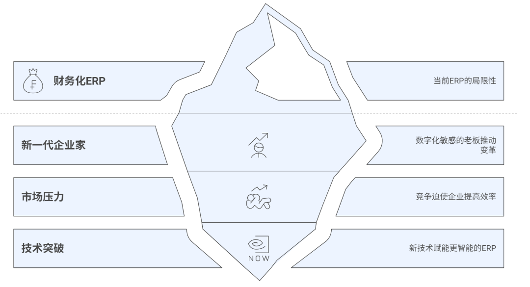 干了这么多年ToB,也算是见证了国产ERP的成长——从早期简单的电算化,到后来对标国际巨头提出“业财一体化”、“全流程管理”、“企业数字神经中枢”……等。 可抛开这些响亮的口号,在很多企业的实际应用中,ERP系统的核心价值并没有完全跳出以财务模块为驱动的范式,依然围着凭证、账簿、报表打转。 老板和管理层评估ERP成功与否的关键标准,还是聚焦于