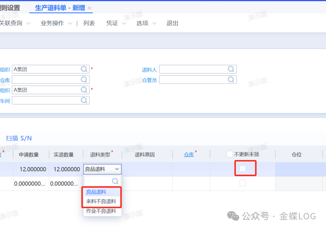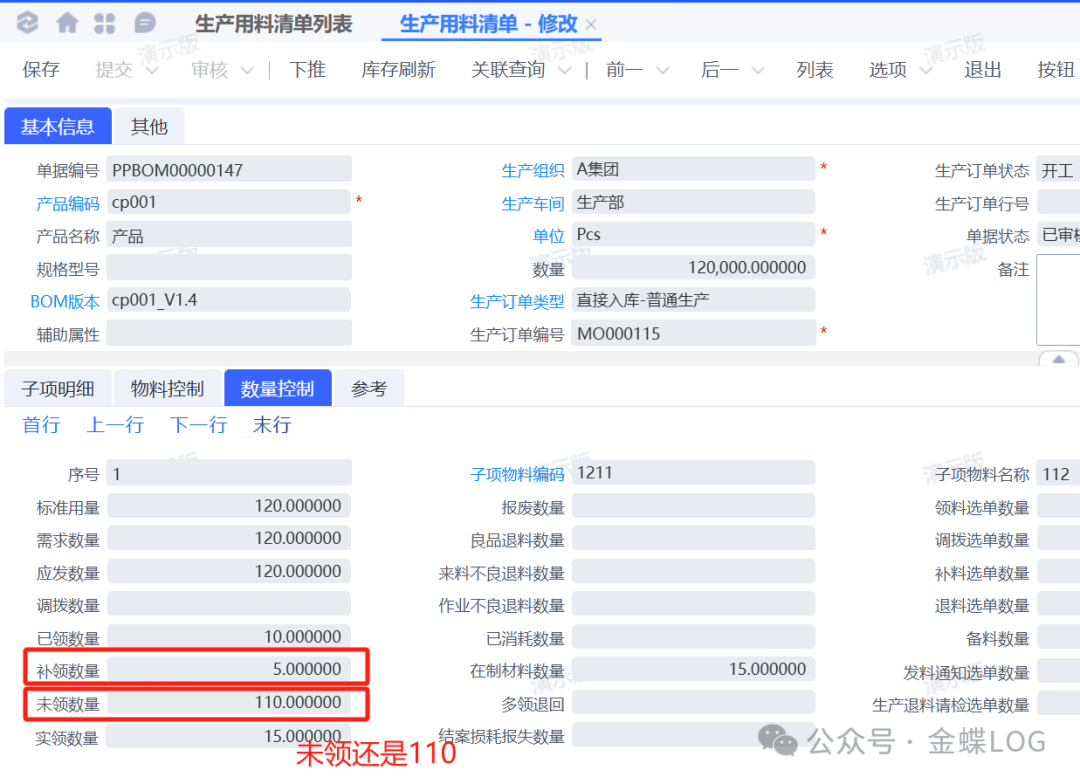 ①生产领料单和生产补料单在系统上的作用。 ②生产领料单和生产补料单对生产用料清单的影响。 ③生产领料单和生产补料单在成本上的处理。 A 问题解答 一、在系统上的作用和对生产用料清单的影响。 ①生产领料单发的是计划内的需求,也就是用料清单的应发数量;领料单在审核之后会反写用料清单的【已领数量】字段,并且会扣减【未领数量】字段; ![]() 生产补料单发的是计划外的需求,也就是一些超领动作;补料单审核后会反写用料清单的【补领数量】字段,不会扣减【未领数量】字段。 ![]() 但是这两个单据都会增加用料清单的【在制材料数量】,也就是说你需求是100个,生产领料单领了90个,生产补料单补了10个;也是能够入库100个的产品。 ![]() ②生产领料单下推出来的数量会受生产用料清单【发料控制】下的参数影响,而补料单不会。 ![]() ③在生产退料之后,是做领料单还是补料单也有区分。主要看退料单上的【退料类型】选的是什么; ![]() 如果选的是【良品退料】和【来料不良退料】,会扣减生产用料清单的【未领数量】(前提是没有勾选【不更新未领】),这时需要通过生产领料单再次出料; ![]() 而选的是【作业不良退料】的话,不会更新【未领数量】,但是会扣减【在制材料数量】,再次领料需要下推生产补料单; ![]() 如果【作业不良退料】你也要走生产领料单,那生产用料清单超发控制方式只能是选择【允许超发】。因为生产领料单发的是需求内的,作业不良一般是产线导致的损耗,正常走的是补料单。