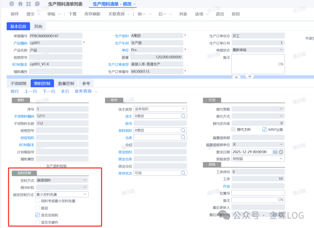 [点晴模切ERP]【金蝶云星空】生产领料单和生产补料单的区别及成本设置