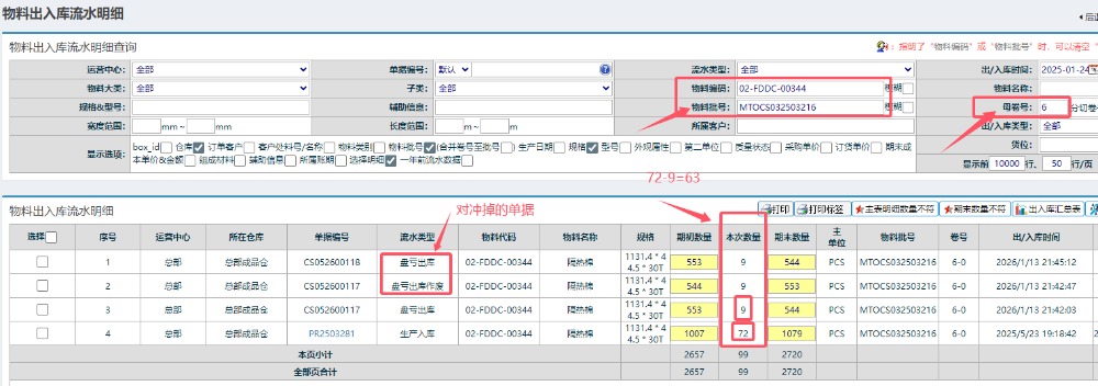 分析数量,期初入库72,盘亏出库9.  最终剩余库存63.  与当前系统库存剩余63完全对上。说明系统计算无误
