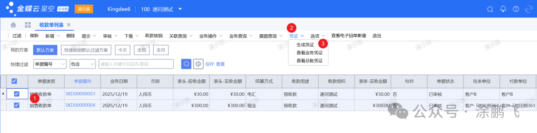 • ①在单据列表界面,多选需要生成凭证的单据。