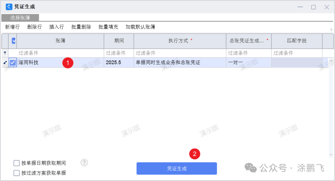 • ①在弹出的凭证生成界面,选择账簿、核对期间和凭证生成方式。