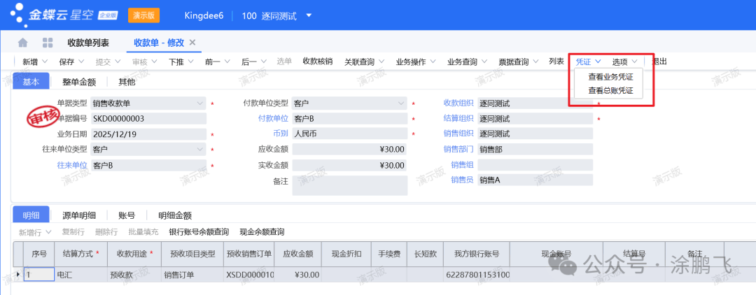 在这我们还有一种方法,我们可以打开当前单据,去到单据页面中去生成,我们这里也以收款单为例子。