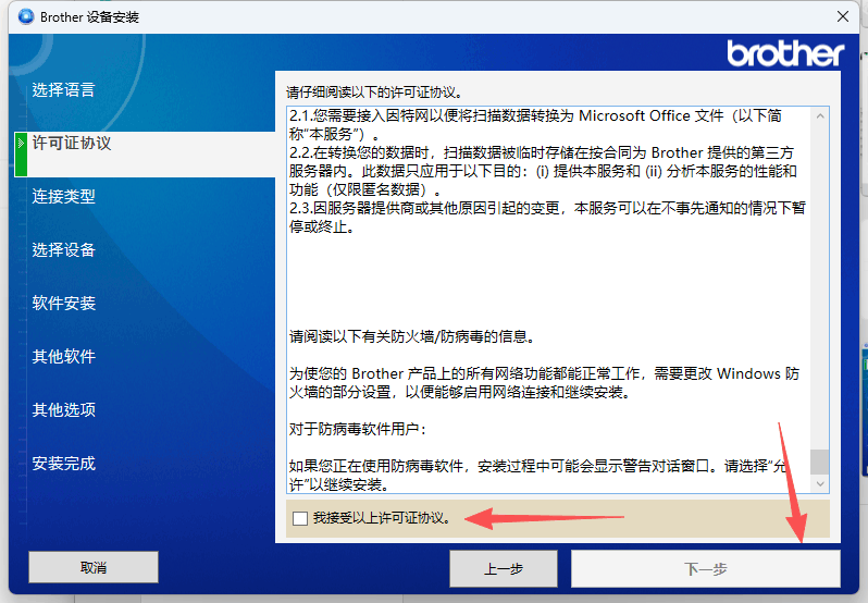 2、勾选上“我接受以上许可证协议”,接着点“下一步”。