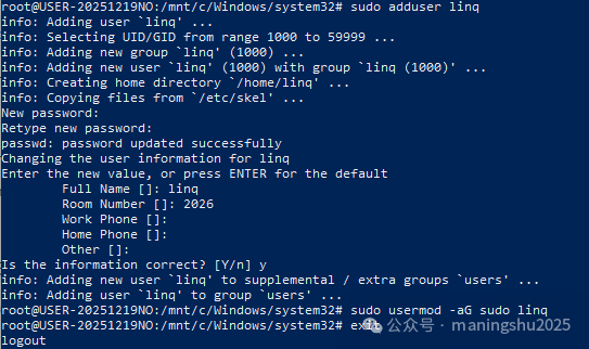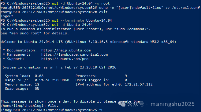 # 进入系统wsl -d Ubuntu-24.04# 新建用户,linq改成你要创建的用户名称,并按照提示输入密码sudo adduser linq# 将用户添加到sudo组中,使其获得管理员权限sudo usermod -aG sudo linq# 退出系统exit# 用root身份登陆系统wsl -d Ubuntu-24.04 -u root# 在WSL的配置文件中设置默认登录用户为linqecho -e "[user]\ndefault=linq" >> /etc/wsl.conf# 退出系统exit# 修改后需要重启才能生效,停止所有进程,释放资源wsl --terminate Ubuntu-24.04# 重新进入系统,能看到已经改成用linq账号登陆了wsl -d Ubuntu-24.04