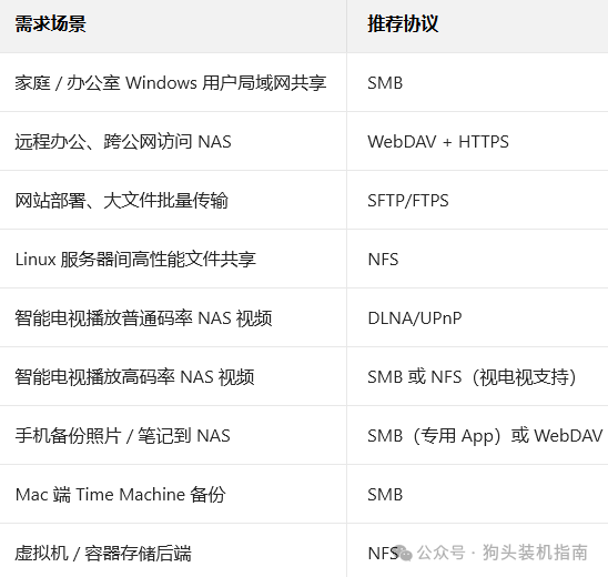 企业 / 技术开发场景:Linux 服务器 / 虚拟化用 NFS,建站 / 大文件传输用 SFTP/FTPS,Windows 客户端用 SMB;