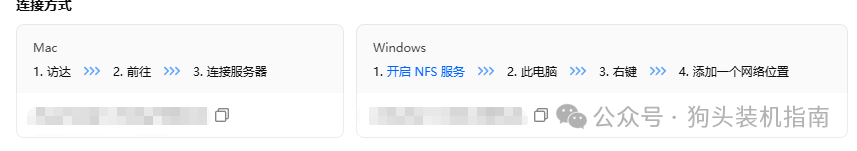 Linux/macOS:执行 sudo mount -t nfs NAS_IP:/export/path/mnt/nfs 命令,或在 /etc/fstab 中添加项实现开机自动挂载;