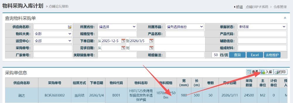 点晴模切ERP采购入库时如何填写上KG数