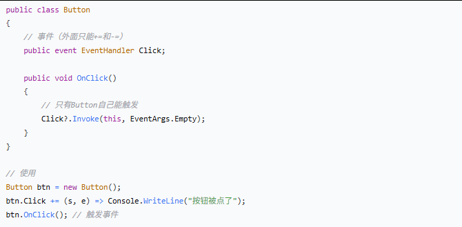 要点:事件比委托多了规矩——只能订阅,不能直接调用