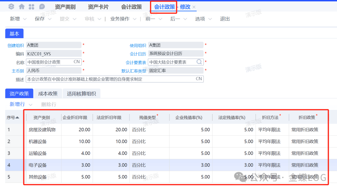 资产的折旧政策、折旧方法、折旧年限、残值率等关键信息,都是依据资产类别来统一设置的。 例如: