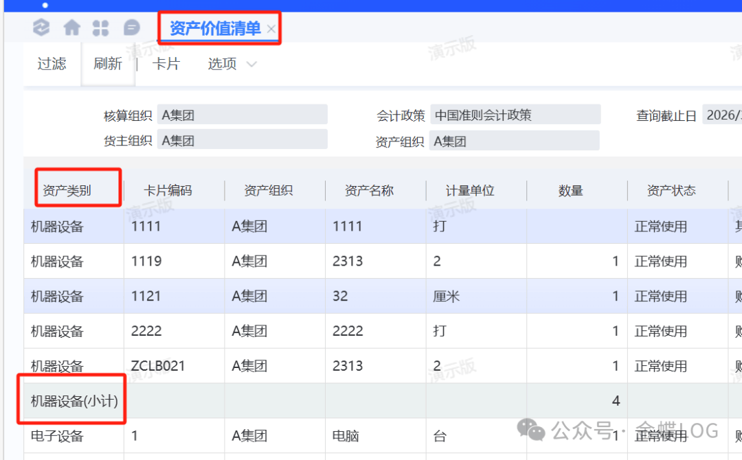 系统各类固定资产报表可以按照资产类别进行分组汇总,如: