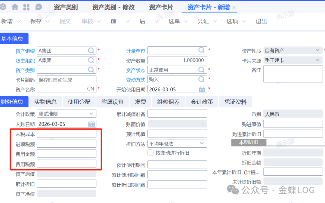 • 若勾选:资产卡片上的“资产原值” = 未税成本 + 进项税额 + 费用金额 + 费用税额