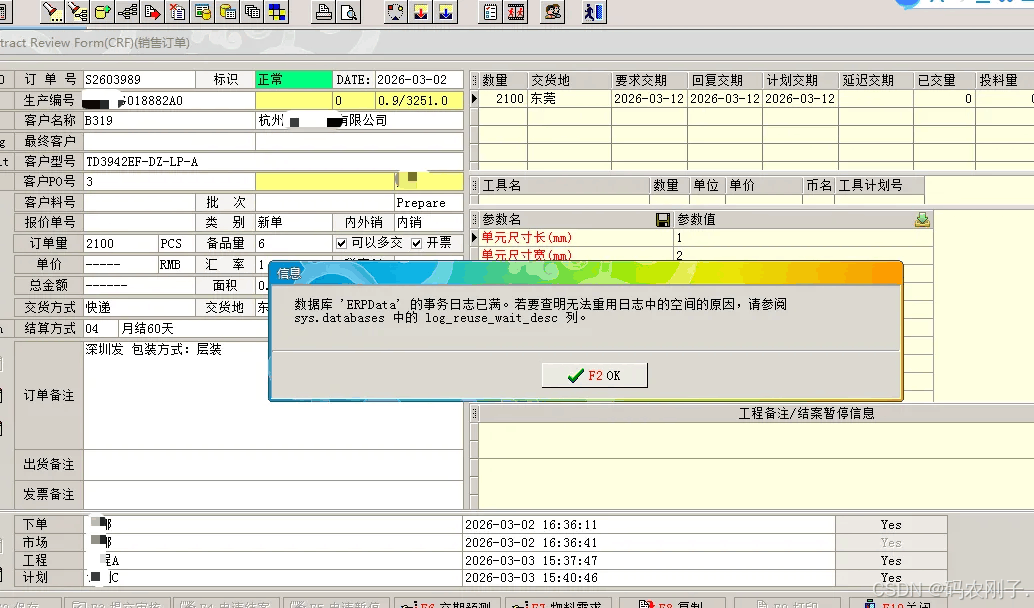 现象:所有功能界面操作长时间无响应,提示:数据库'ERPData'的事务日志已满。若要查明无法重用日志中的空间的原因,请參阅sys.databases 中的 log_reuse_wait_desc 列。