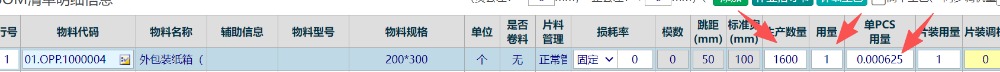 加载后,对应非卷料栏位填上数值即可,例如纸箱用量,1600个成品用一个纸箱,填写内容如下