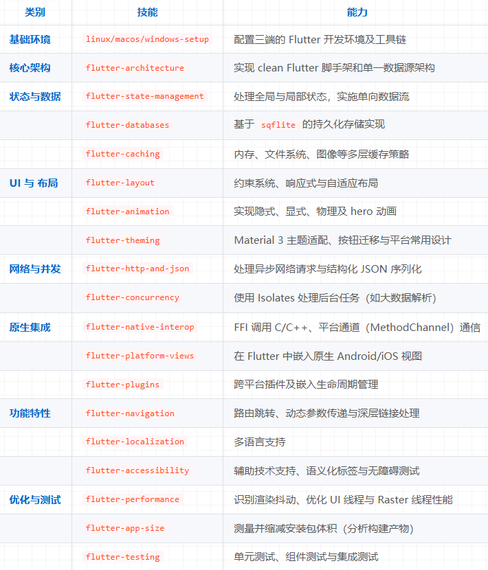 flutter/skills 作为给 AI Agent(Agent / Copilot / Claude / Cursor 等)用的技能库,核心目标是让 AI 在 Flutter 项目里,面对执行复杂开发流程时,AI 有相应的规范和指导流程 :