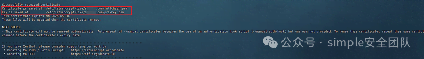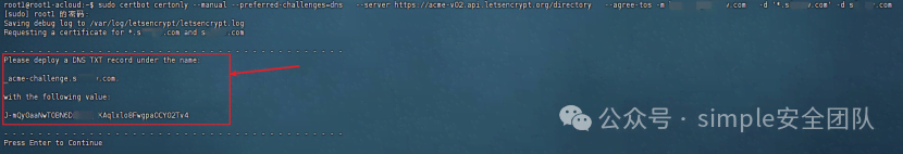 通配符证书必须通过DNS验证方式申请,因为Let's Encrypt需要验证您对域名的控制权。1、执行以下命令开始申请通配符证书,执行完之后不要点击Enter键,要等确定TXT记录生效之后才能点击Enter键:sudo certbot certonly --manual --preferred-challenges=dns \ --server https://acme-v02.api.letsencrypt.org/directory \ --agree-tos -m your-email@example.com \ -d '*.simple.com' -d simple.com