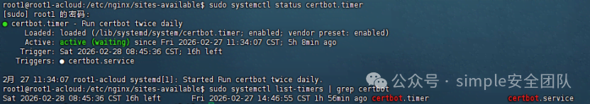 当命令返回的结果中包含您设置的两条TXT记录值时,说明DNS记录已生效。此时返回Certbot交互窗口,按回车键继续。7、DNS验证通过后,Certbot将自动生成证书文件。成功后会显示类似以下信息:1、Certbot默认会安装自动续期服务,您可以通过以下命令验证sudo systemctl status certbot.timer