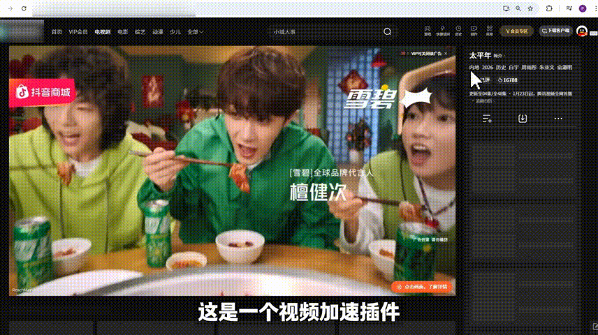 这是一个视频加速插件,你可能会说视频平台里都有倍速播放,它这个不一样,它除了可以加速视频,还可以加速视频里的广告,1分钟的广告瞬间变成几秒钟。你就说香不香。