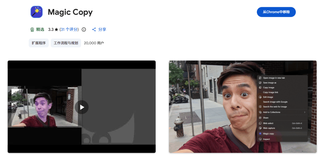抠图不用再去下载任何软件,浏览网页时直接点击右键,选择magic copy,就可以瞬间完成操作,速度特别快,而且100%完全免费。