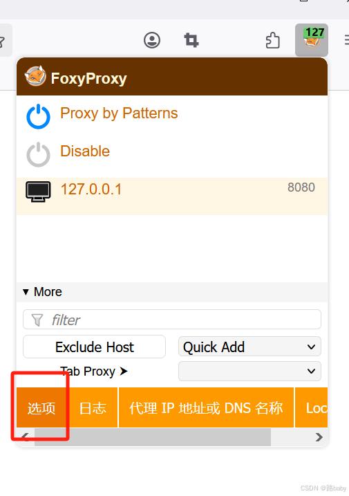 然后我们刚刚说需要让他转发到8080端口 所以我们这里需要进行一个设置 我们打开小狐狸 点击选项