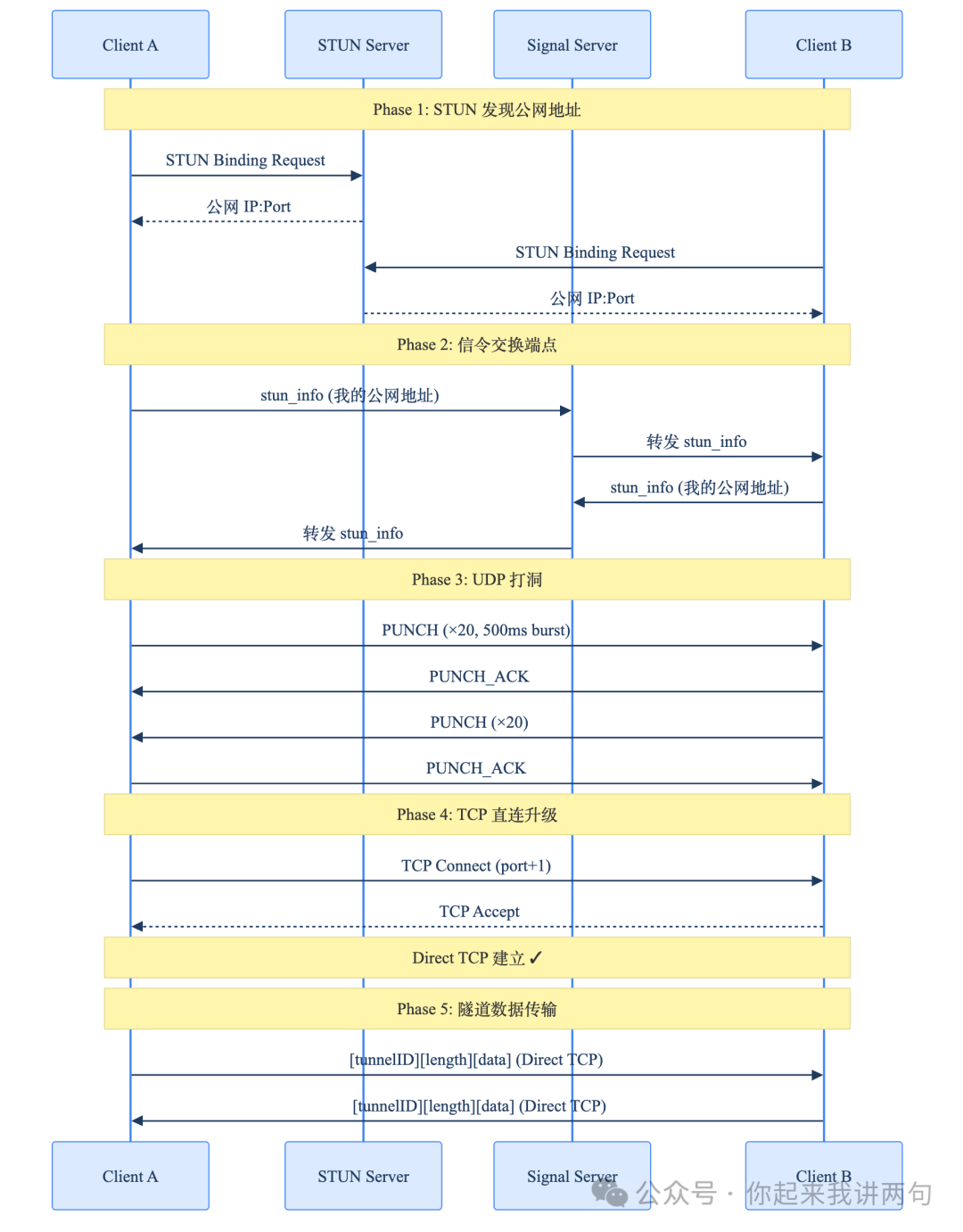 两个 client 通过信令服务器交换各自的公网地址,然后同时向对方发 UDP 包。这就是经典的「UDP Hole Punching」—— 双方同时往对方的 NAT 上「戳洞」。
