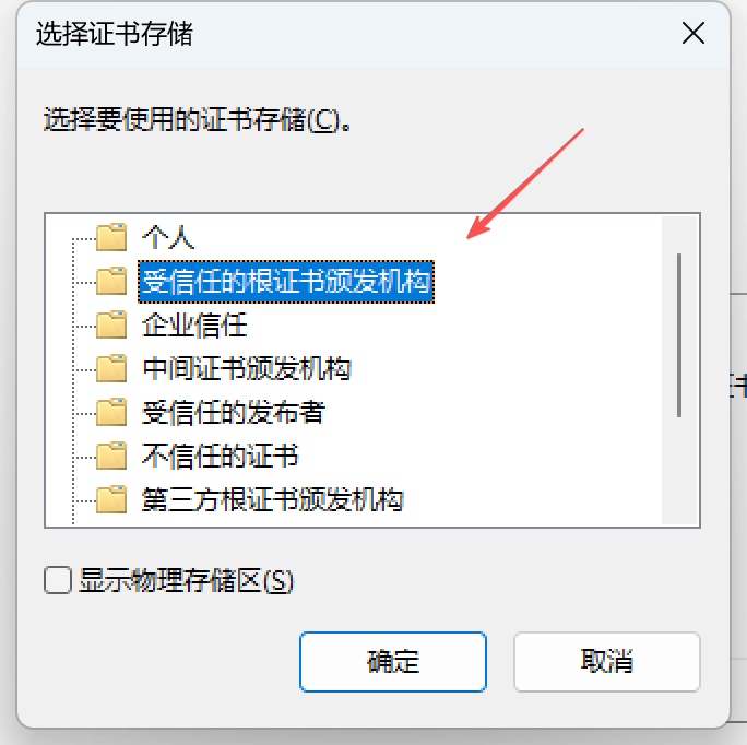 - 双击证书,根据指引安装证书。证书安装过程,要确保证书存储到受信任的根证书颁发机构下