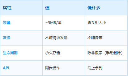 • LocalStorage = 床头柜,大容量、不发送、永久保存