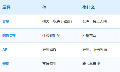 • IndexedDB = 仓库,最大但操作复杂
