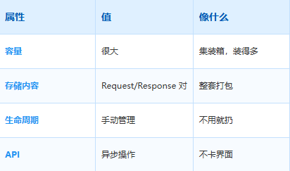 Cache API 存储的是完整的 Request/Response 对,不只是 body: