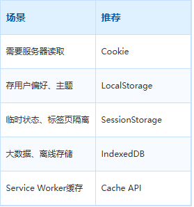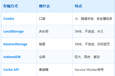 浏览器存储也是这个道理。不同的数据,要用不同的"收纳工具"。