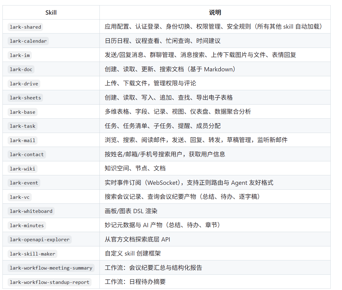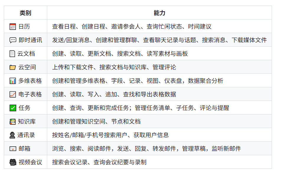 至此,你就可以在 这时候,一定、一定、一定记得重启一下你的Claude Code、Codex、OpenCode等等Agent产品! 这不是装个Skill热重载就可以用了,记得重启。 目前,飞书CLI支持这些功能操作权限。