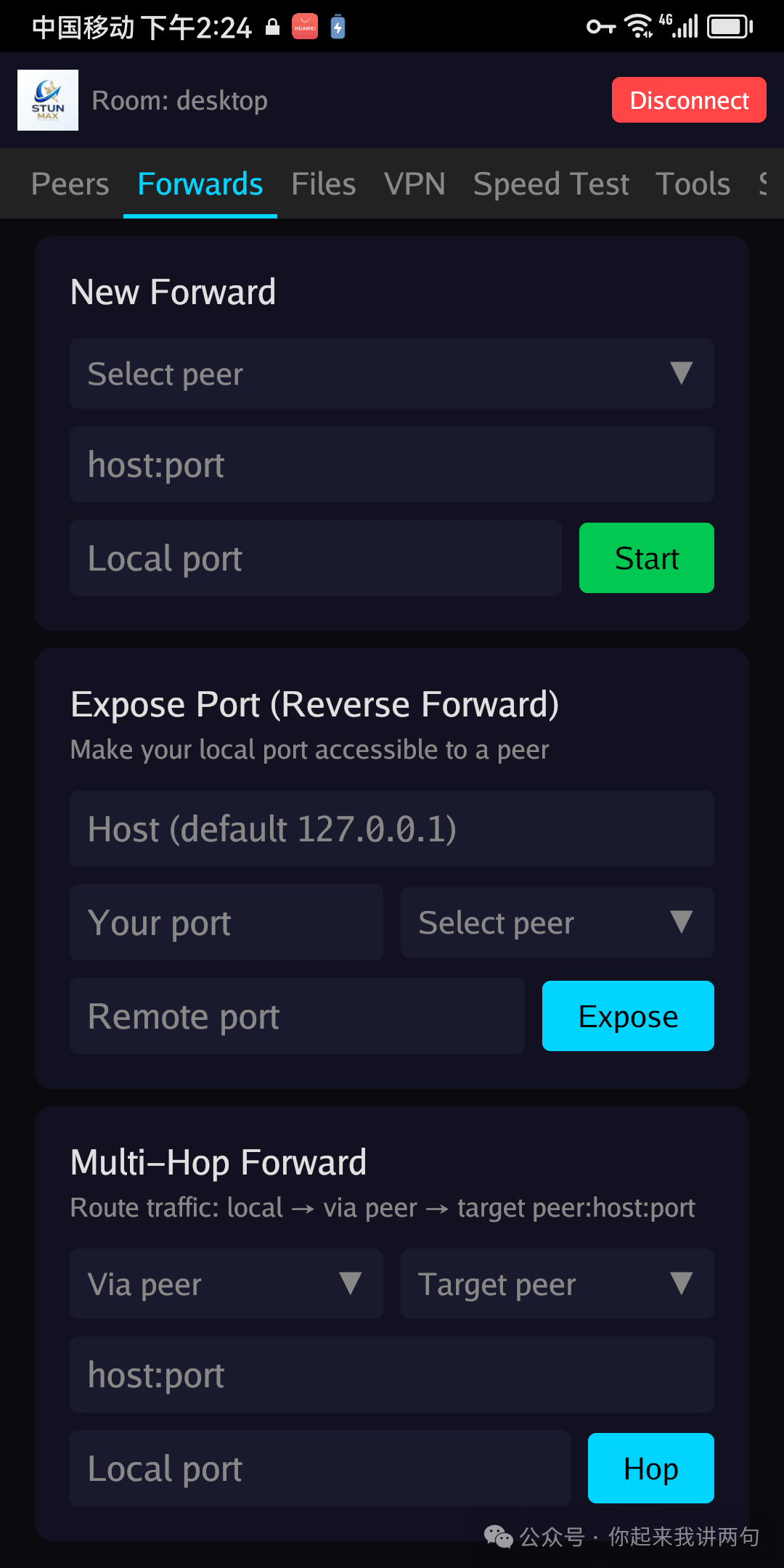 ▲ Peers 节点发现 Forwards 端口转发 把远端服务的端口映射到本地。支持同时转发多个端口,一键启停。