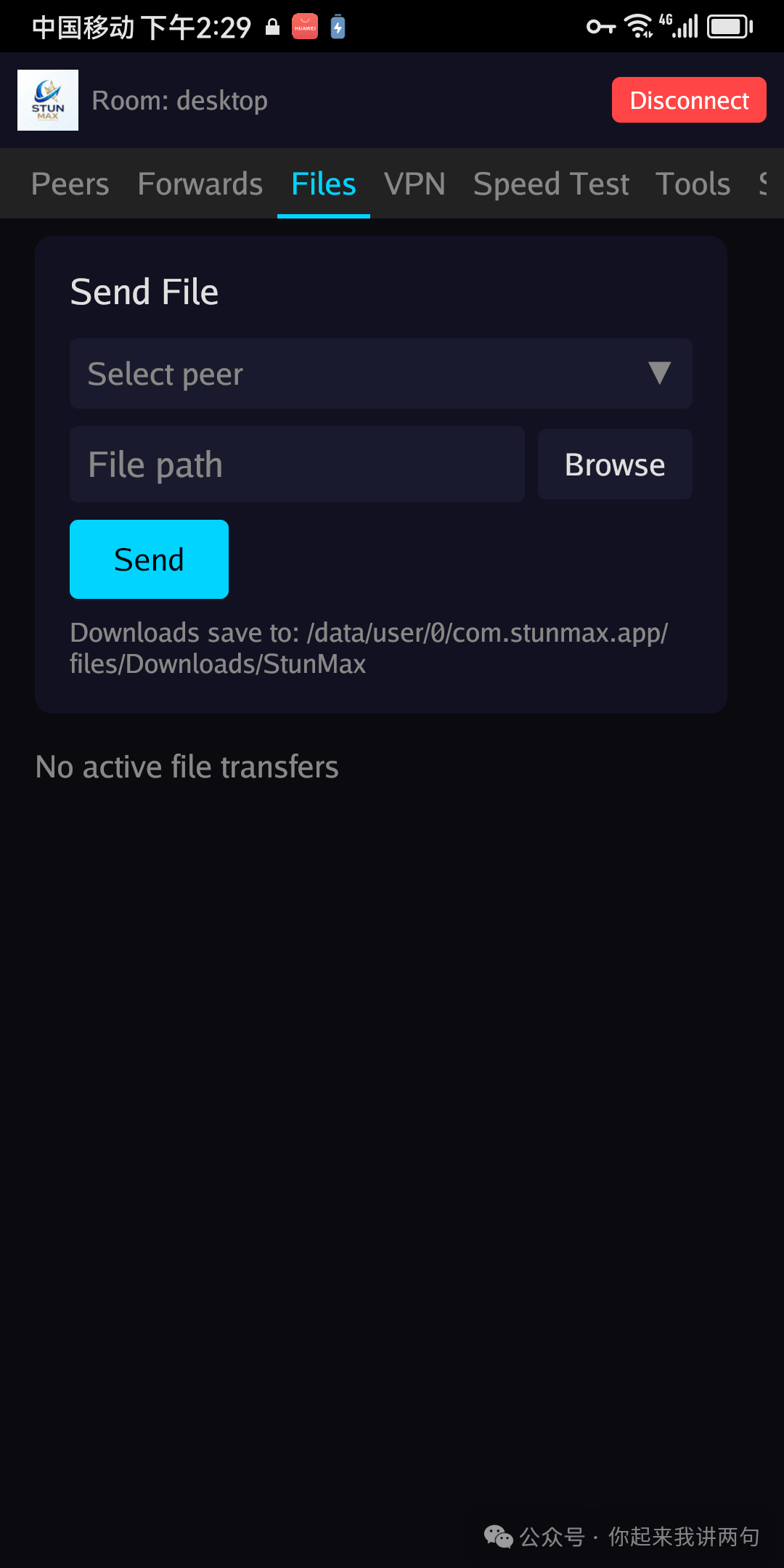 ▲ 图 1:STUN Max 系统架构 整个系统分三层:Signal Server 负责房间管理和转发信令,客户端通过 WebSocket 加入房间后发现对端。接着用 STUN 探测 NAT 类型,尝试 UDP 打洞建立 P2P 直连。如果打洞失败,自动回退到服务器 Relay 中转。 这套设计的好处是用户无感知——不管是 P2P 还是 Relay,上层的端口转发、文件传输、VPN 都透明工作。 八大功能模块一览 Peers 节点发现 实时显示房间内所有对端的在线状态、NAT 类型、连接方式(P2P/Relay)和延迟数据。支持多节点同时在线。
