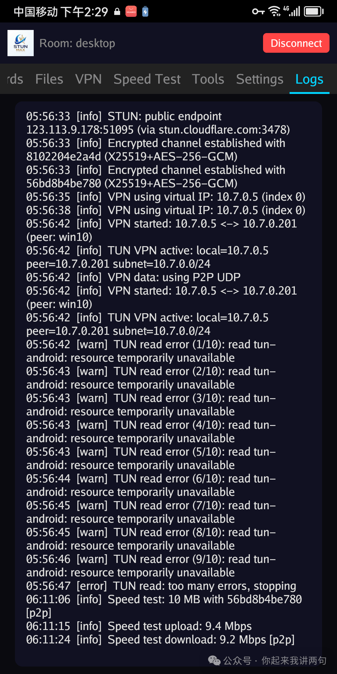 坑 4:Multidex FindClass 失败 Go 生成的 Android 库文件较大,触发了 Multidex 限制。在 Android 5.0 以下版本,必须显式启用 Multidex,否则启动时直接 ClassNotFoundException。 坑 5:APK 构建流水线 Go + Android NDK 交叉编译的工具链配置非常繁琐。最终用 GitHub Actions 搞定了自动化构建,支持 arm64 和 arm32 双架构。整个流程从代码推送到 APK 产出大约 8 分钟。 P2P 核心技术:打洞 + 加密 + 隧道 全链路加密基于 X25519 ECDH + AES-256-GCM。每次建立连接时,双方生成临时密钥对,通过 ECDH 协商出共享密钥,然后用 AES-256-GCM 加密所有隧道数据。即使中转服务器也无法解密内容。 隧道协议设计得很简单:open_tunnel → tunnel_opened → tunnel_data(base64)→ close_tunnel。所有消息都封装在 relay_data 信封里,服务器只负责转发,不解析内容。 gVisor 用户态协议栈是整个 VPN 的基础。它让我不需要系统级权限就能处理 TCP/IP 包,这在 Android 上尤其重要——因为 VpnService 只给你一个原始的 TUN fd,你得自己拆包。 真实场景:我是怎么用的 场景 1:远程访问家里的 NAS 家里的群晖 NAS 在 NAT 后面,没有公网 IP。之前用 frp 转发,但需要一台公网服务器且带宽受限。现在用 STUN Max,两台设备加入同一个房间,P2P 直连,下载速度直接拉满家里的上行带宽。 场景 2:远程开发调试 公司的开发机在内网,在外面用笔记本想访问上面跑的服务。用 STUN Max 把开发机的 8080、3000、22 端口都转发到本地,curl localhost 就能调试。 场景 3:临时文件传输 给朋友传大文件,不想经过云盘。两人打开 STUN Max,加入同一个房间,直接拖拽文件就能 P2P 传输。速度取决于两人的网络,不经过中间服务器。 性能数据