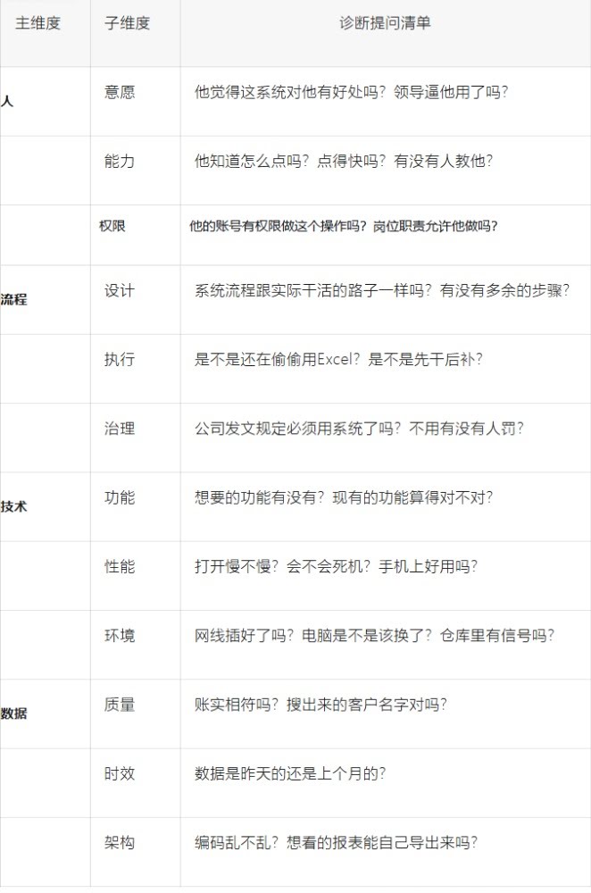 这四个变量像钻石的四个顶点,相互依赖、相互影响。改变其中一个,必然牵动其他三个。如果只改技术,而任务、人员、结构纹丝不动,变革注定失败。 二、四个维度还是太粗?用MECE原则切下去1. 人的因素:意愿 vs 能力人的问题,归根结底就3个:想不想做,会不会做,能不能做。三者互不重叠,加起来就是人的全部。 意愿(主观能动性)——想不想做认知层:员工理解为什么要上ERP吗?知道系统能带来什么好处吗? 利益层:系统对他个人是威胁还是帮助?用了是扣钱还是发奖金? 情感层:是不是习惯了过去的方式,对新系统本能地抵触? 能力(客观条件)——会不会做知识层:培训到位了吗?知道每一步该点哪里吗? 技能层:知道步骤,但在业务繁忙时能熟练操作吗?( 生理/认知极限:比如年龄大的员工打字慢,或者视力问题影响操作 权限(组织边界)——能不能做角色权限:系统账号是否配置了相应的操作权限? 职能权限:岗位职责是否允许他执行这个操作? 资源权限:是否有权调动完成任务所需的资源(数据、人员、设备)? MECE检验: 一个人想做、会做,但没有权限 →权限问题 一个人想做、有权限,但不会做 →能力问题 一个人会做、有权限,但不想做 →意愿问题 三者互斥(意愿、能力、权限是三个不同的维度),且加起来就是“人”的全部:任何一个人的行为受阻,必然是因为这三个原因中的一个或多个。 在经典的莱维特钻石模型中,“权限”其实被归入了“结构”(Structure)维度——组织的权责分配、沟通机制和权力层级。 在ERP系统中,“权限”往往是“流程治理”的一部分(谁有权审批、谁有权修改),但也直接作用于“人”——一个操作者即便意愿和能力兼备,如果账号权限没配好,照样动弹不得。 2. 流程的因素:设计、执行、治理流程的问题可以从三个层面看:路有没有修好,大家有没有走路,有没有人指挥交通。 流程设计(逻辑层)匹配度:系统里的流程和实际业务场景一致吗?比如公司常有紧急采购,系统却要求必须走三天招标流程 合理性:流程有没有冗余节点?比如需要三个人审批,但第三个人经常出差,流程就卡住了 闭环性:流程有没有反馈?录了数据,能不能看到结果? 流程执行(操作层)bypass率:有没有线下纸质单和线上并行?有没有绕过系统的“潜规则”? 合规性:是否严格遵守系统路径?比如先斩后奏、事后补单 流程治理(制度层)制度保障:公司有没有明文规定“不走系统怎么处罚”? 权责分明:每个节点的负责人清楚自己的职责和时限吗? MECE检验:流程问题要么是“路没修好”(设计),要么是“有路不走”(执行),要么是“没人指挥交通”(治理),三者互斥且穷尽。 3. 技术的因素:功能、性能、环境技术问题往往被简单理解为“软件有bug”,但其实它包含三个独立的方面:能不能做、做得快不快、在哪儿跑。 功能(做什么)完整性:系统有没有这个功能?是不是需要二次开发? 正确性:功能有,但算出来的数对不对?逻辑有没有bug? 易用性:操作是否便捷?比如需要点5次才能完成,能不能优化成1次? 性能(快不快)响应速度:点击后几秒加载?超过3秒用户就容易烦躁 稳定性:会不会闪退、卡死?并发量大时会不会宕机? 兼容性:在不同浏览器、不同手机上表现一致吗? 环境(在哪跑)网络基建:服务器部署在哪?分公司带宽够吗?仓库里有WiFi信号吗? 硬件设施:电脑配置是不是太低了?扫码枪、打印机适配吗? MECE检验:技术问题要么是“做不到”(功能),要么是“做得慢”(性能),要么是“环境不允许跑”(环境),三者边界清晰。 4. 数据的因素:质量、时效、架构数据是ERP的血液,数据问题可以拆成:准不准、新不新、好不好用。 数据质量(准不准)准确性:系统里的数据和实物/账目一致吗?比如库存数量对不对? 完整性:必填字段都填了吗?有没有大量空值? 一致性:同一个客户,销售部和财务部的名称一样吗?(比如“IBM”和“IBM中国”) 数据时效(新不新)及时性:数据是业务发生时录入的,还是隔天补录的? 周期性:月结、年结能按时完成吗?数据会不会滞后? 数据架构(好不好用)标准化:编码规则统一吗?物料编码是数字还是乱码? 可获取性:用户能方便地从报表获取数据吗?还是每次都要找IT导出? MECE检验:数据问题要么是“脏”(质量),要么是“旧”(时效),要么是“乱”(架构),三者互斥且全面。 实战清单:当你坐在客户面前现在,我们把所有维度汇总成一张快速筛查表。下次客户说“系统没用起来”,你可以一边听,一边在心里默默过一遍这些问题: