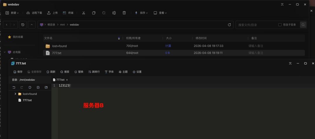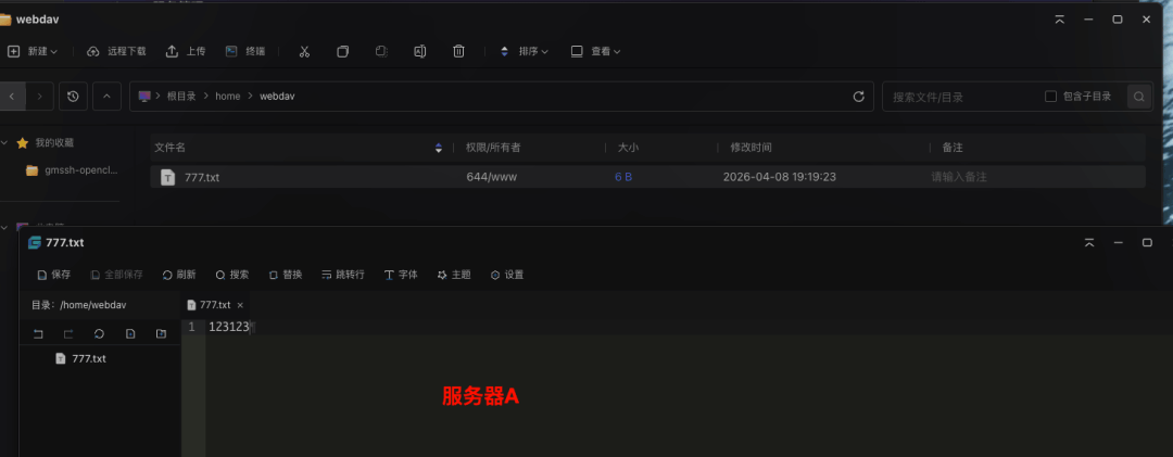 新建一个文件,并且写入,到被挂载的服务器A查看是否同步发现同步正常,功能验证成功,这样,我们就完成了通过nginx快速搭建WebDav服务实现服务器之间的文件共享