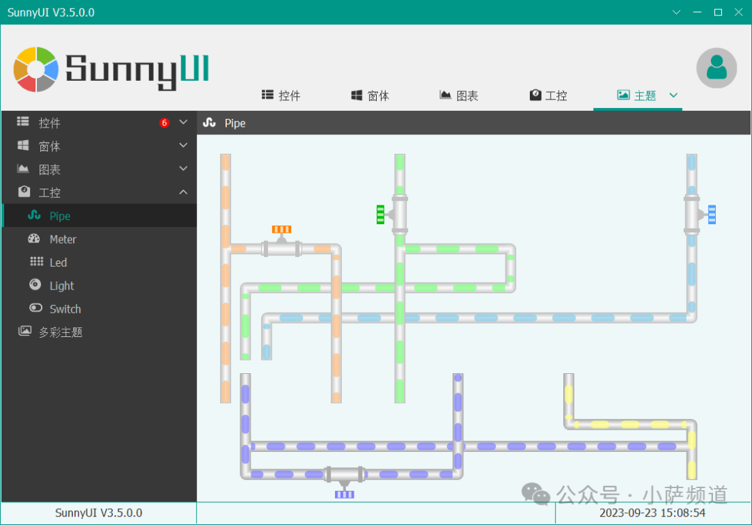 这些控件如果自己从头写,耗进去的时间不是一两天。 第二,17 套主题,一键切换。 SunnyUI 内置了 17 套主题风格,包括蓝色、绿色、红色、紫色等常见配色,以及一套从 Element UI 借鉴而来的设计语言(所以叫 SunnyUI)。用起来只需要一行代码: 对于需要换肤能力的桌面应用,这个功能是实打实的工程节省。 第三,多页面框架,7 套模板。 这是 SunnyUI 最被低估的功能。它内置了 7 种多页面应用框架模板,参考了 Element UI 的页面组织方式,主frame + aside 导航 + 内容区,配合 做企业管理软件、数据监控系统,这种"主界面 + 多页面"的架构是最常见的。用 SunnyUI 的框架模板,搭一个这样的系统比你想象中快很多。