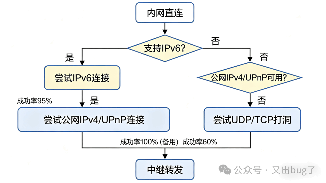 与 FRP 最大的不同在于:OpenP2P 不需要你自己购买公网服务器。它借助社区成员自愿贡献的“共享节点”形成一个庞大的 P2P 网络,从而让任意两台设备都能找到通路。 ![]() 1.1 主要特点无需公网 IP:你不需要拥有自己的云服务器,OpenP2P 的公共信令网络会帮你完成节点发现。 P2P 直连优先:成功打洞后,数据传输走直连通道,速度不受服务器带宽限制,能跑满家庭宽带的上行带宽。 高穿透成功率:号称支持所有 NAT 类型(包括对称型),综合成功率可达 99% 以上。 轻量级:单个可执行文件仅 2MB+,运行时内存占用约 2MB。 跨平台:支持 Windows、Linux、macOS、Android、iOS、OpenWrt 等。 安全:P2P 隧道采用 TLS 1.3 + AES 双重加密,共享节点接入使用 TOTP 动态口令授权。 1.2 典型使用场景远程桌面:从外网直接 RDP 或 VNC 到家里/公司的电脑。 访问 NAS:在外通过 SMB、WebDAV 访问家里的 NAS 文件,速度跑满上行带宽。 SSH 登录:远程管理内网服务器。 HTTP/S 服务:将内网的 Web 开发环境临时暴露给同事预览。 ![]() 二、核心架构:去中心化的 P2P 共享网络OpenP2P 的架构可以看作是一个庞大的、去中心化的“互助组”。它主要由三个层次构成: [图片:OpenP2P 三层网络架构图 - 底层是本地网络(LAN),中间是私有 P2P 网络(同一用户的设备),顶层是公共 P2P 网络(社区共享节点)] ![]() 2.1 组件角色P2PNetwork(核心协调器):全局大脑,管理应用实例、隧道连接和消息路由。 P2PApp(服务映射单元):每个 App 实例负责将本地的一个服务(比如 SSH)映射到 P2P 网络上。 P2PTunnel(连接通道):底层的数据通道,封装了 UDP/TCP 等协议。 信令网关(Signaling Gateway):公共的 WebSocket 服务,负责节点认证、地址交换和中继协调。 2.2 网络分层模型本地网络(Local Network):如果两个设备在同一个局域网内,数据直接在局域网传输,速度最快。 私有 P2P 网络(Private Network):同一个用户的多台设备可以组建私有网络,互相转发数据,不依赖公共节点。 公共 P2P 网络(Public Network):由社区志愿者贡献的节点组成,为无法直连的设备提供兜底中继。 这种分层设计确保了无论网络环境多么复杂,总能找到一条可达的路径。 三、工作流程:智能的路径选择算法当你想从设备 A 访问设备 B 的服务时,OpenP2P 会按照以下优先级逐级尝试建立连接: ![]() 内网直连:检测双方是否在同一网段,如果是,直接内网 IP 通信。 IPv6 直连:如果双方都有公网 IPv6 地址,优先使用 IPv6 TCP 直连。 公网 IPv4 / UPnP:如果一方有公网 IPv4 地址,或者成功通过 UPnP 申请了端口映射,则使用 TCP 直连。 NAT 穿透打洞(UDP/TCP Hole Punching):这是最核心的一步。双方通过信令服务器交换各自的 NAT 类型和预测端口,然后同时向对方发起连接,尝试建立 P2P 直连。 中继转发(Relay):如果上述所有直连方式都失败,数据将经由私有网络或公共网络中的其他节点进行中转。虽然中转会增加一跳延迟,但保证了 100% 的连通性。 这套算法体现了 OpenP2P 的设计哲学:不惜一切代价先尝试直连,实在不行再用中继保底。 四、技术原理:如何攻克 NAT 难题?OpenP2P 实现高成功率打洞的背后,是一系列扎实的网络技术。 4.1 NAT 类型检测OpenP2P 在启动时会通过 STUN 协议探测本地 NAT 的行为模式,将其简化为两大类: 锥形 NAT(Cone NAT):相对宽松,同一个内网地址端口映射到同一个公网端口,外部主机只要知道这个公网端口就能向内发包。 对称型 NAT(Symmetric NAT):最严格的 NAT,每个不同的外部目标都会映射到不同的公网端口,导致传统的打洞技术几乎失效。 ![]() 4.2 针对不同 NAT 组合的打洞策略4.3 QUIC 协议加速在成功建立的 UDP 通道上,OpenP2P 使用了QUIC 协议(基于 UDP 的新一代传输协议)。QUIC 集成了 TLS 1.3 加密、0-RTT 连接、多路复用等特性,特别适合在高丢包、高延迟的“弱网”环境下提供稳定传输。 ![]() 五、OpenP2P vs FRP:核心差异与选型建议