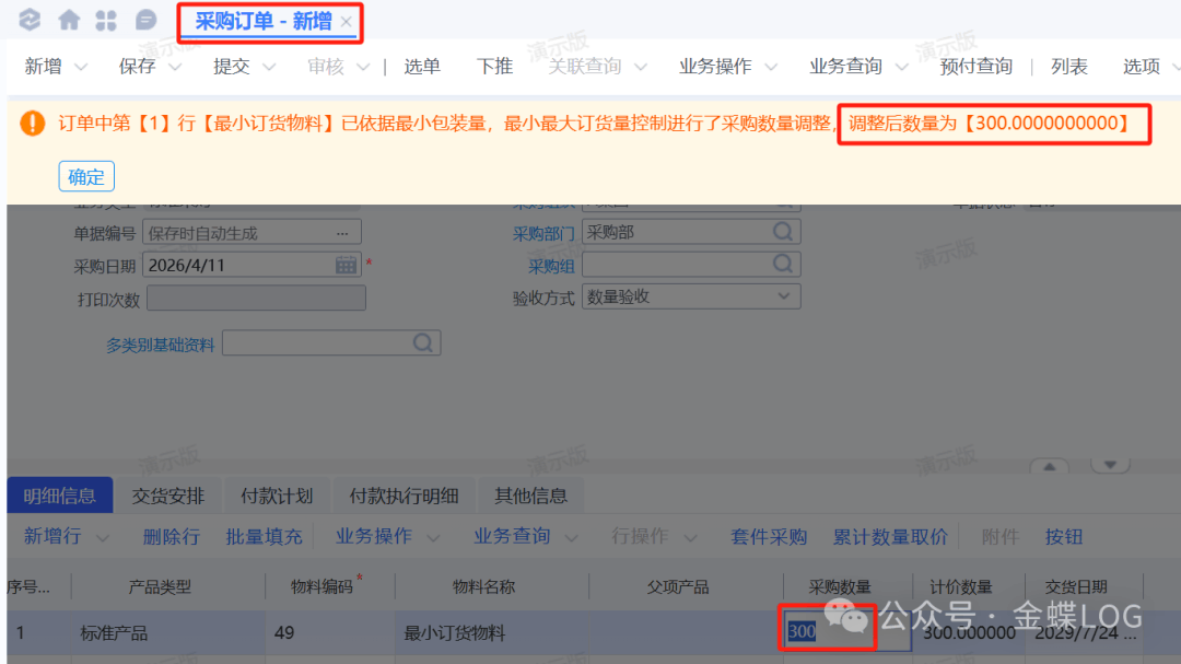 三、最小订货量的作用最小订货量,是指在发生采购需求时,最小的单次订货数量。即使实际需求量小于这个数值,采购时也必须按最小订货量下单。 设置与操作