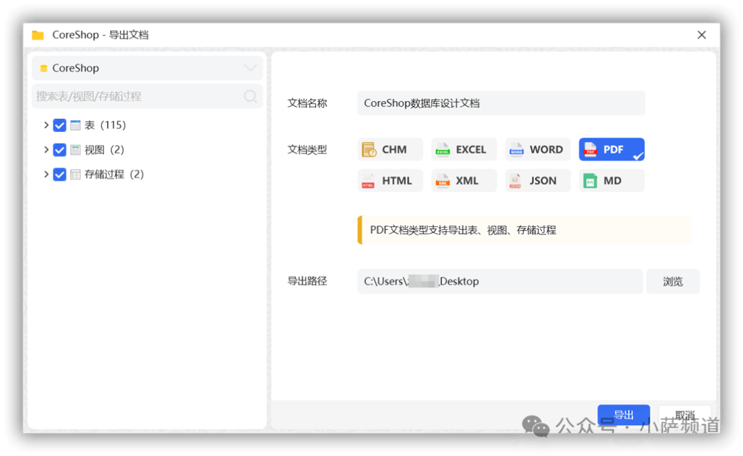 选择要导出的对象(单个表、整个分组、或者全部),选择导出格式,点击导出。