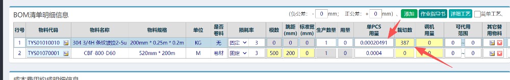 在裁切栏位填写对应的排版数值,标准数值会自动形成(注意基础资料对应的宽,长,厚,重量,密度等信息需要完善才行)。