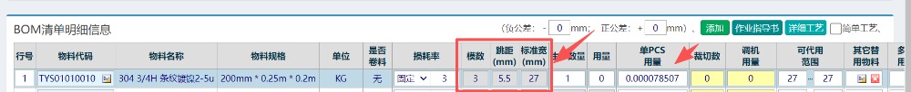 说明:模数栏位填写,对应宽度的排版数(下图所示,27宽,可排版3PCS),宽度栏位填写开料宽度,跳距填写产品长度+排废间距(下图所示,例如产品长4MM,排废1.5,则对应填写5.5即可)