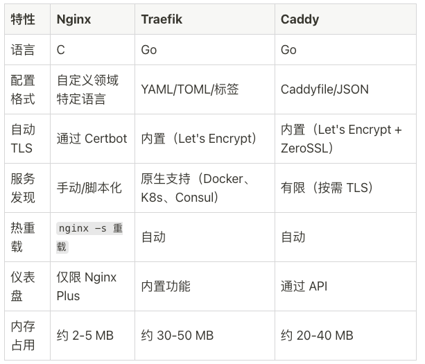 三大反向代理网站软件 Nginx、Traefik、Caddy 的区别是什么?
