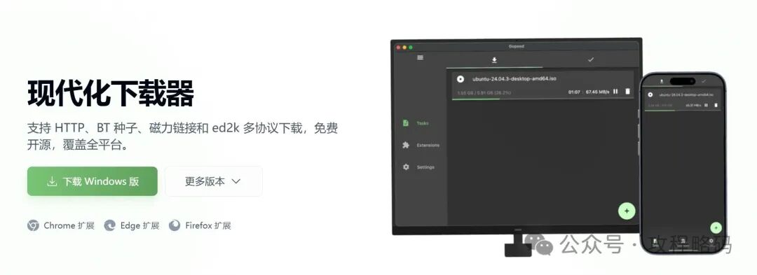 在过去的一段时间里自己一直在寻找一款好用的下载器,折腾过深受全球用户欢迎的IDM (全称 Internet Download Manager),因其多线程下载可以将原本蜗牛般的下载速度提升几倍甚至几十倍而闻名。但由于是付费软件迫于无奈最终不得不放弃使用,并且不支持切换中文,英文界面对中文用户非常不友好,相信大家也像我一样折腾过它吧。新安装的用户可以免费使用30天。30天体验完成后,于是了解到了 Gopeed 。从名字就可以看出,它是一款使用go编写的轻量的现代化下载管理器。在github中拥有24k的Star,且完全免费开源。覆盖全平台,我觉得这是它最强大的地方,几乎支持了所有的平台,可以说是无所不能。这应该也是大家选择它最大的原因吧。支持 HTTP、BT 种子、磁力链接和 ed2k 多协议下载,这和其他下载器大差不差。