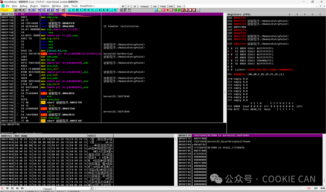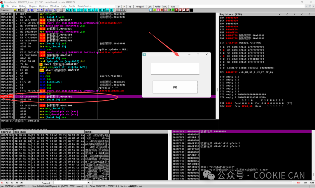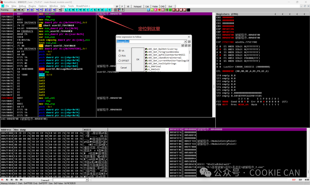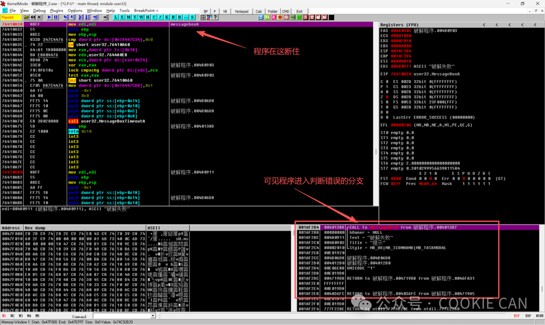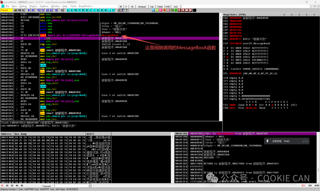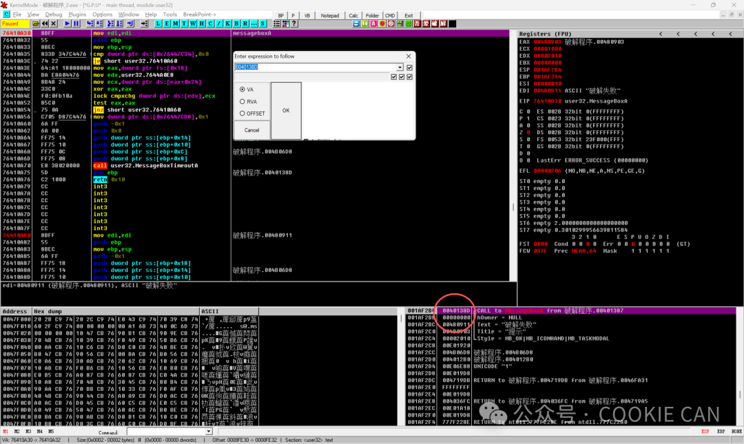 MessageBoxA是 Windows 提供的一个系统函数,用来专门调用一些错误和正确的提示窗口,直接说可能不是很明白,但是看下图你就明白了:学习这个系统函数是因为我们观察到,弹出的错误弹框正是调用了这个函数,那么我们不就有思路了吗,在这个函数这里下断点,那么往回跟一定就是判断关键验证点的地方啊!!!首先把软件拖入od(Olly Dbg)中,一进来是这个界面,注意点在什么地方:还记得刚学的MessageBoxA吗,按住ctrl+G,直接搜索这个,定位到这个点后可以在这加上个注释(按一下;可添加messageboxa注释)按F8一步步走下去直到把程序运行出来,然后观察是哪个点触发了弹窗函数,按F2下断点在这里:然后随便输入一个数字,点击按钮后程序就来到了我们下的MessageBoxA这个断点处,此时注意观察栈的地址(右下角),程序进入错误弹窗的分支(准备弹出错误提示)001AF2B4 0040138D /CALL to MessageBoxA from 破解程序.00401387