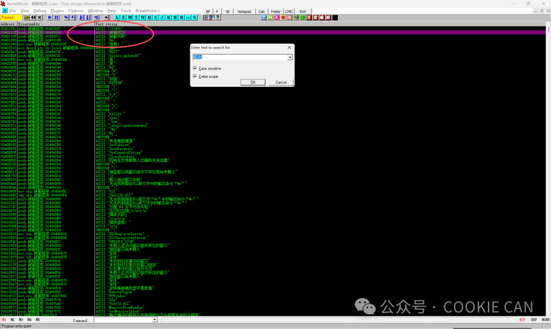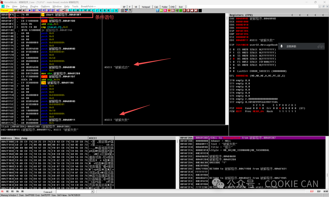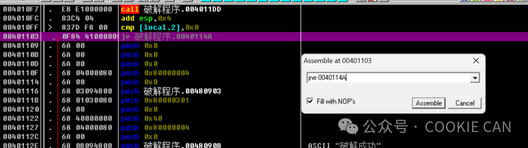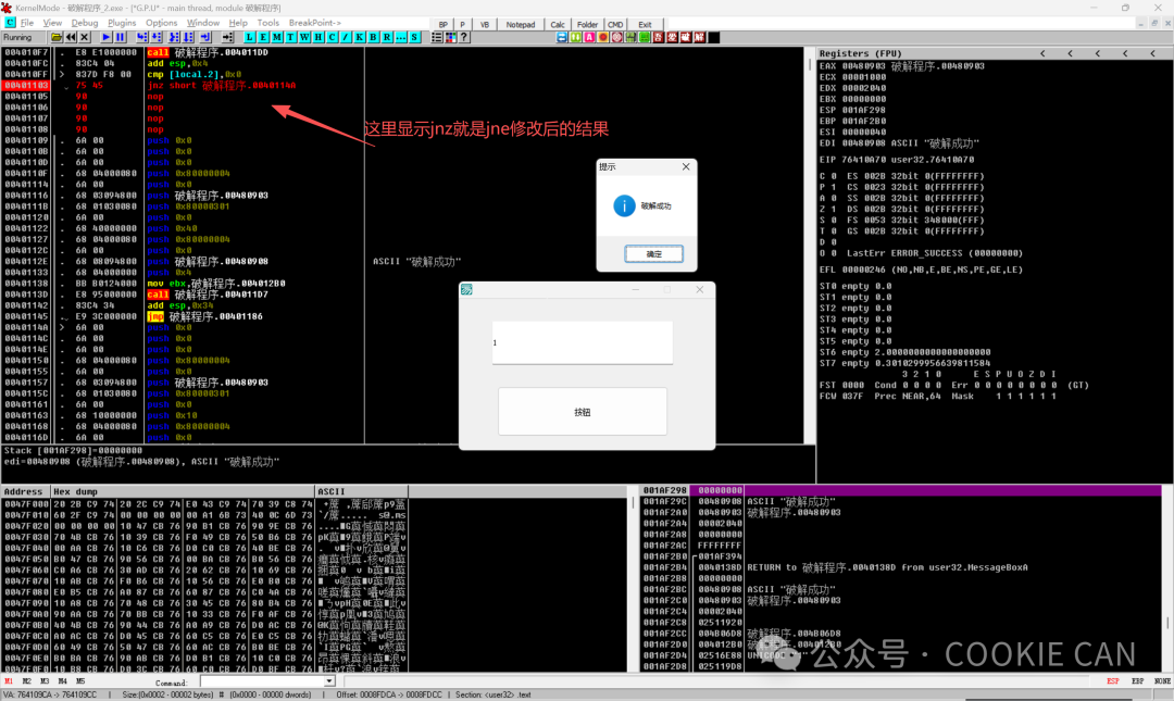 第二个参数就是退出这个错误窗口的地址,我们要知道,主程序是在运行的过程中才调用这个错误的函数的,所以我们要退出分支函数,回到主函数,才可以找到关键验证点,所以直接ctrl+G搜索这个地址回到主函数中很明显这就是关键点位置!!!,而且看到有je判断语句,je表示什么呢?既然是这样的话,那我们把断点下在这,然后把je改成jne看看会发生什么聪明的人可能看到了,既然有显示字符串 “破解成功”,那是不是可以直接搜索字符串啊,说的没错,确实是简单的做法,那我就直接搜索看看有没有:很明显,是有的,更离谱的是验证码都给出来了:123456,但是我为啥不一开始就讲这个方法,而是讲正常的思路呢,因为字符串可以被改为16进制的字节,如果别人一开始就将这些字符串换成16进制或者其他编码的符号,那么你怎么搜出来呢,举个例子,以上就是些破解的大概思路,有兴趣的朋友可以了解一下,看一下
