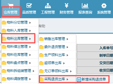 操作步骤:仓库管理——物料出库管理——采购退货出库——新增采购退货单;进入页面如下图所示: