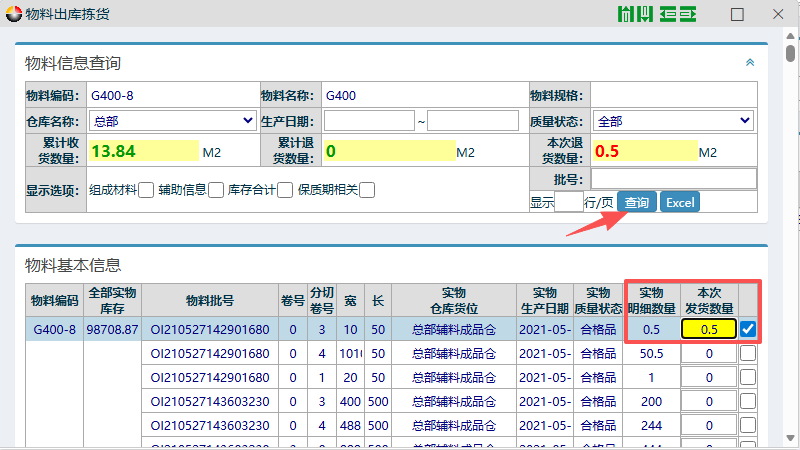 ​然后出现如下图所示页面,点击查询。选好对应的物料信息勾上对应的退货数量,点击下方的“提交拣货数量”