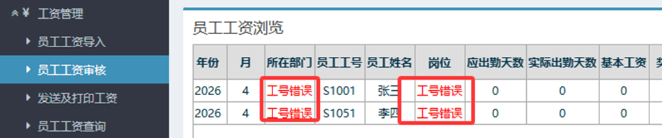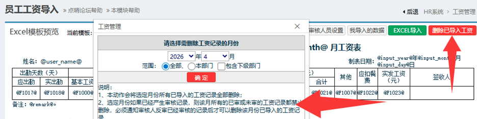 如上图所示的错误,前往删除2026年4月的记录(员工工资导入-删除已导入工资):
