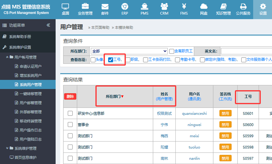 重新导入,前往用户管理,比对EXCEL文件,确认用户工号、姓名、部门信息正确: